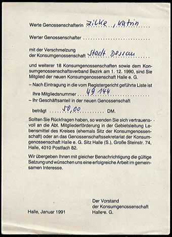 Die Neu - Organisation der KONSUM Genossenschaften war nach dem beigefügten Dokument des KONSUM Halle bis zum Jahresende 1990 abgeschlossen. Die Lokalen Zusammenschlüsse der Genossenschaften führten wieder zu eigenständigen Unternehmen. Mit dieser Neugestaltung erfolgte wohl auch die Ausgabe der "Neuen" Rabattmarken. |