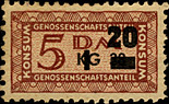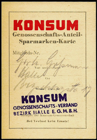 ![]() Ausgabe durch die KONSUM Genossenschaft Halle Anteile a ,50 (Pfennige) = Karte = 5,- DM |