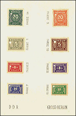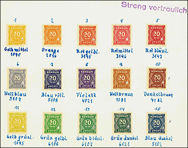 Die beigefügten Marken-Entwürfe (Farbbezeichnungen) stammen ebenfalls vom Zentralkonsum e.G. (Berlin). Ob diese alle in die Praxis überführt wurden ist nicht bekannt (aber sehr wahrscheinlich). Aus welchem Farbtafelwerk die Bezeichnungen entnommen wurden ist nicht bekannt. Farb-Varianten der 1,- DM Werte |