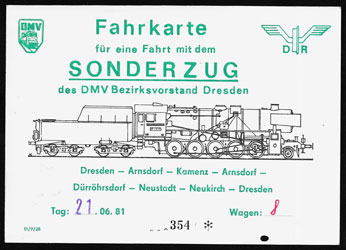 | Fahrkarte- Sonderzug "Dresden-Arnsdorf-Dresden" | Fahrkarte (Erwachsene) | Eintrittskarte, DR, Verkehrs Museum Dresden, DMV | ||