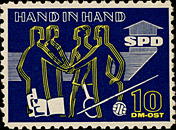 Die Sozialdemokratische Partei Deutschlands hat die Kurzbezeichnung SPD. Die KPD, deren aus Moskau heimgekehrte Führung zunächst scharf gegen die spontanen Initiativen zur Bildung einer einheitlichen Arbeiterpartei vorgegangen war, änderte gegen Ende 1945 ihre Haltung und drängte die SPD zu einer Vereinigung der beiden Parteien. Dies wurde durch Repressalien seitens der sowjetischen Besatzungsmacht bestärkt. Die KPD wollte die Macht in Ostdeutschland, und die SPD hatte die erforderliche Basis von 600.000 Mitgliedern dazu. Auf dem gemeinsamen Parteitag am 21. und 22. April 1946 kam es in der SBZ zu einer Zwangsvereinigung von SPD und KPD zur SED (Sozialistische Einheitspartei Deutschlands). Dies geschah auf einem „Vereinigungsparteitag“, auf dem manche Delegierte der SPD aus der SBZ und Delegierte der KPD aus ganz Deutschland unter Kontrolle der Sowjets standen. Zahlreiche ostdeutsche Sozialdemokraten, die sich dem Druck nicht beugen wollten, flohen in die Westzonen. Die Ortsvereine der SPD im sowjetisch besetzten Sektor Berlins, bestehend aus Mitgliedern, die sich nicht der SED angeschlossen hatten, existierten noch bis 1961. |