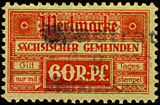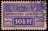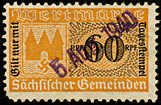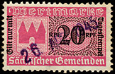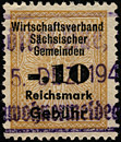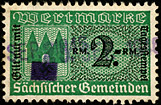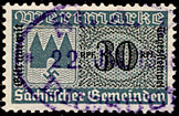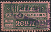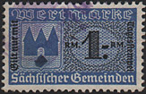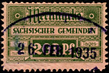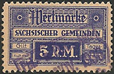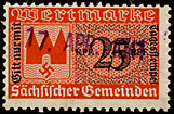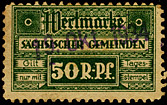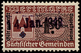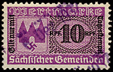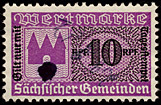 | Gebührenmarken sächsischer Gemeinden aus dem Deutschen Reich. Diese wurden entweder durch Übermalung, Überstempelung oder Lochung entnazifiziert (Hakenkreuz entfernt). | |||||||||