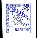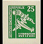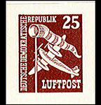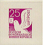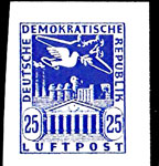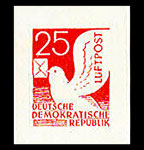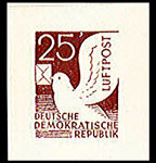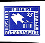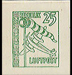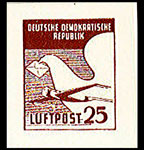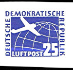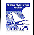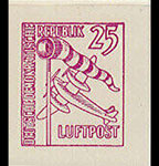 | Diese Markenentwürfe für den Luftfrachtverkehr (Aufdruck Luftpost) wurden anläßlich der internatinalen Briefmarken-Ausstellung DEBRIA (DEutsche BRIefmarken Ausstellung) 1950 in Leipzig gefertigt. Diese Markenentwürfe sind als "prvate Drucke" nicht im MICHEL Katalog gelistet. Sie wurden im Jahre 2021 auf der amerikanischen Website von Ebay veräußert. Angaben zum Herausgeber wurden nicht gemacht. Der Frankaturwert der Marken von 25 Pfennigen entsprach dem damaligen Porto für die Briefbeförderung per Luftfracht. | |||||||||