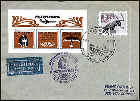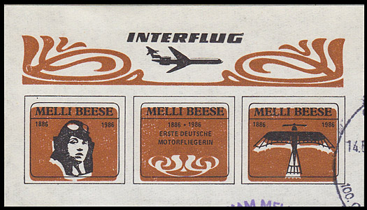 | Werbebogen der INTERFLUG anlässlich des 1. Deutschen Motorfluges einer Frau "Melli Beese", Der Bogen wurde sowohl als kompletter Werbeträger, als auch in Teilstücken auf Briefen angebracht | ||||