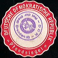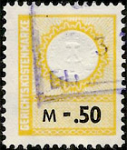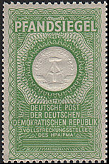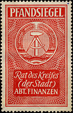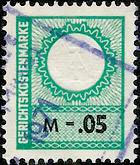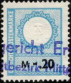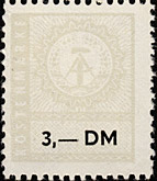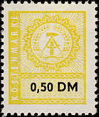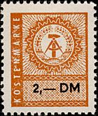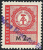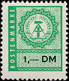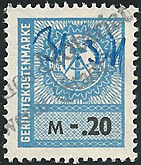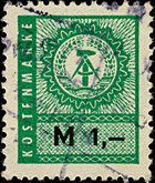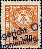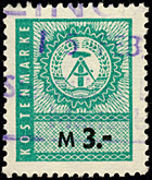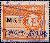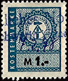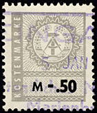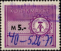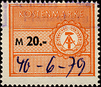 | Kostenmarken mit gedruckten Staatssymbol -neu- (Hammer-Zirkel-Ährenkranz), Währung "M"; das "M" mit schrägen Außenlinien, nach der Zahl ein Punkt | |||||||||