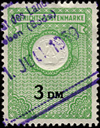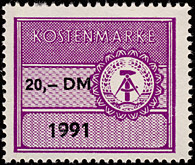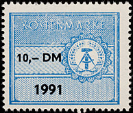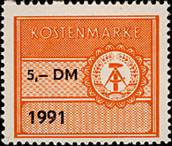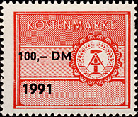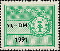 | Kostenmarken der "noch-DDR", mit gedruckten Staatswappen; jetzt wieder mit der Währung "DM" (nach der Währungsunion) | ||||||||||