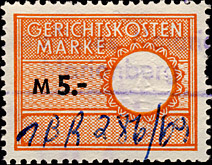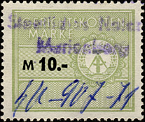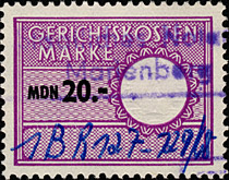 | Gerichtskostenmarken mit geprägter Justitia, Währung "RM" und handschriftlich nach Einführung der neuen Währung in "Ost" und "West" unterschieden | |||||||||||||