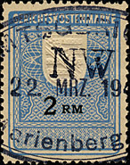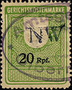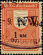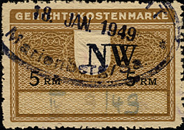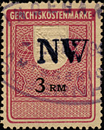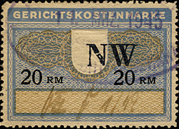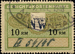 | Gerichtskostenmarken mit geprägten Landeswappen, Währung "RM" und Zusatzaufdruck "NW" für Neue Währung | |||||||||||||