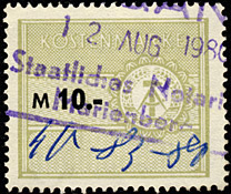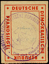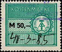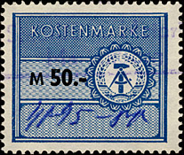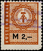 | Kostenmarken mit gedruckten Staatssymbol -neu- (Hammer-Zirkel-Ährenkranz), Währung "M"; das "M" mit senkrechten Außenlinien, nach der Zahl ein Komma | ||||||||