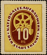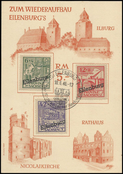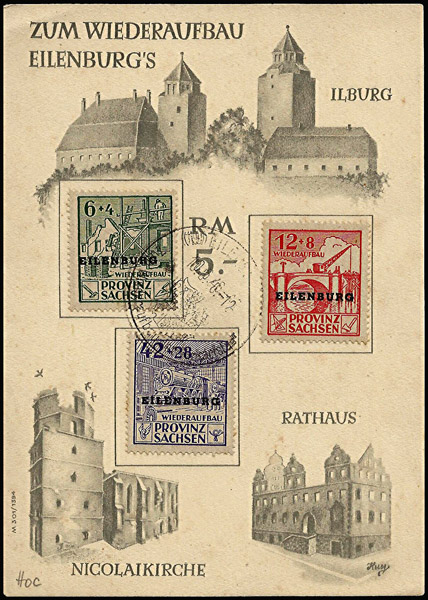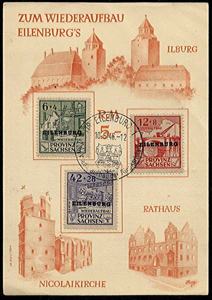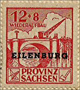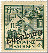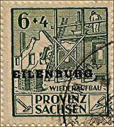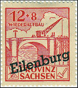 | Die postalisch verwendeten Wiederaufbaumarken der SBZ/Provinz Sachsen, siehe Michel-Katalog für 1946, wurden mit dem Aufdruck "Dessau" oder "Eilenburg" versehen. Sie verloren dadurch ihre Frankaturkraft und konnten als reine Spendenmarken verwendet werden. |