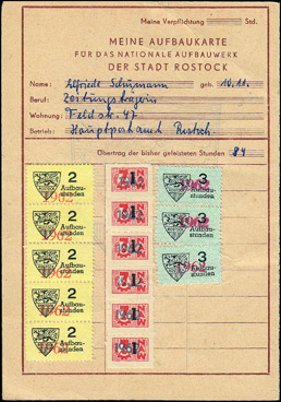 | Beispiele von Marken gleichen Bildes, mit Zusatzstempel "NW" für Personen, die im Ramen des NAW im Bereich der Neptunwerft tätig waren |