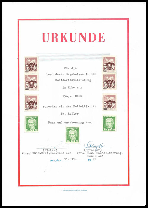 | Spenden-Urkunde des FDGB Kreisvorstandes Aue | Spendenbeleg für "Soforthilfe" der Naturkatastrophe in Nicaragua (Adressat nicht bekannt) | |||