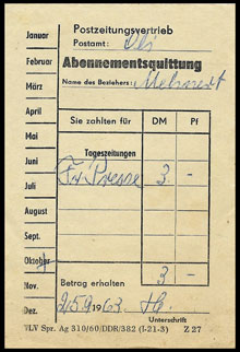 | DM 2.10 (Monatsabo) | Politische Agitation + Werbung für weitere Zeitung | DM 6.10 (Monatsabo) | DM 3.05 (Monatsabo) | ||||||||
