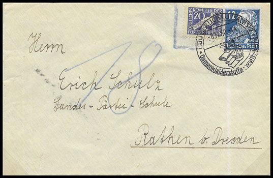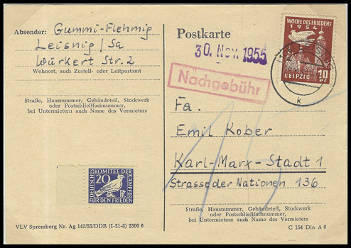 | Postkarte - von der Post beanstandet - Nachporto 18 Pf | Brief - von der Post unbeanstandet - Spendenmarke zusätzlich zum Porto | ||||