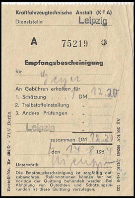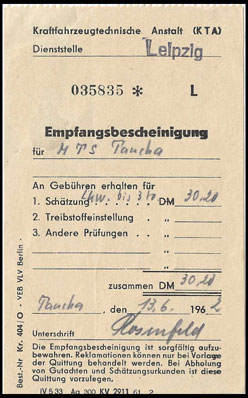 | Mit der Auflösung der (alten) Länder wurde eine neue Struktur hinsichtlich der Verantwortung für die Sicherheit im Straßenverkehr erforderlich. In dem Zusammenhang erfolgte die Errichtung der Kraftfahrzeugtechnischen Anstalt (KTA) im Oktober 1953. Die Gründung erfolgte „zur Sicherung des wirtschaftlichen Betriebes des gesamten Kraftfahrzeugparks der Deutschen Demokratischen Republik und zur Vereinheitlichung des Schätzwesens“. | |||||||||||