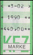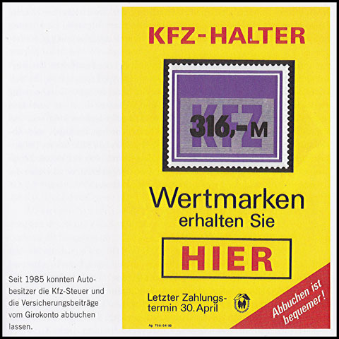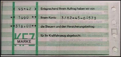 Ab 1984 konnten die Halter von Kraftfahrzeugen die fälligen Beträge für die Haftpflichversicherung und die Kfz-Steuer von ihrem Girokonto abbuchen lassen. Dies wurde ab 1985 massiv beworben, wie der beigefügte Beleg beweist. Die für den Kfz-Versichertenausweis erforderlichen Marken wurden mit den Kontoauszügen erstellt und den berechtigten Personen ggf. per Post zugestellt. Die notwendigen „Buchungs-Marken“ wurden nur als Gesamt-beitragsmarken erstellt. Die auf-wendige Stückelung wurde damit vermieden. Die entsprechenden Buchungsbelege wurden durch die Nutzer selbst auf die entsprechende Größe geschnitten und in die Kfz-Versichertenausweise eingeklebt.(siehe beigefügtes Beispiel eine kompletten Buchungsbeleges aus dem Jahre 1990)