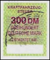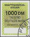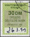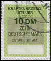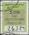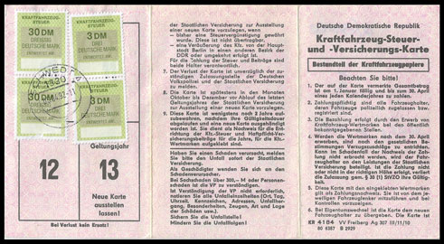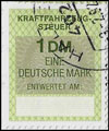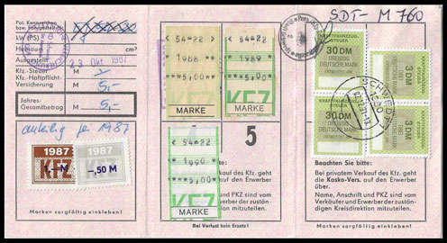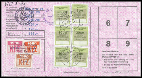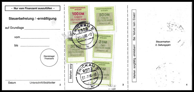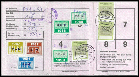 Mit den Regelungen zur Deutschen Einheit wurden für die neuen Bundesländer Regelungen zum Einzug der Kfz-Steuern (mit Änderung des Bundesdeutschen Rechts) erforderlich. Neben der Verwendung bisher schon genutzter Steuerkarten wurden nun ab 01.01.1991 auch neue Steuerkarten verwenden. Diese Karten enthielten nur noch Angaben zum Hubraum des Kfz. und der entsprechend zu zahlenden Kfz-Steuer. |