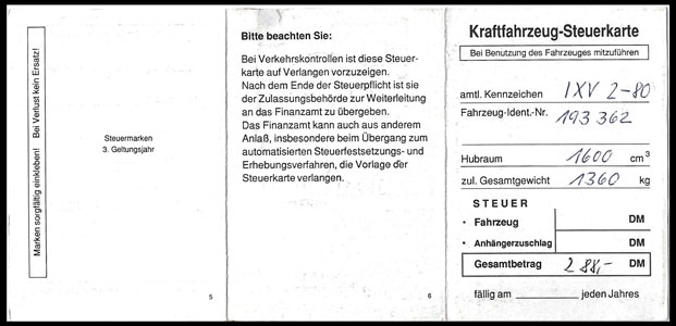 Jahressteuerbetrag 288,- DM / Hubraum 1.600 ccm |