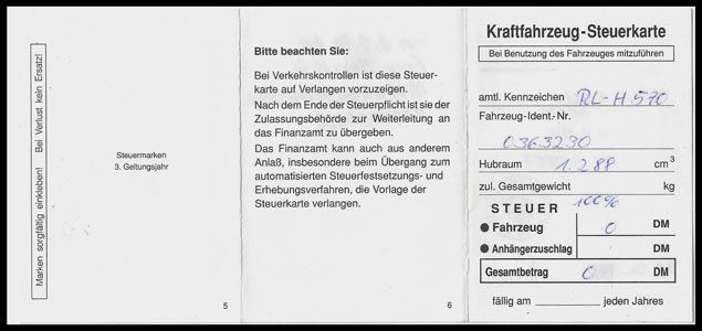 | neue Steuerkarte für Kfz mit Angabe des Hubraumes und Jahressteuer | ||
