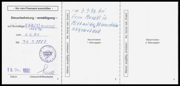 | neue Steuerkarte für Kfz mit Angabe des Hubraumes und Jahressteuer - hier 100 % Steuerbefreiung | ||