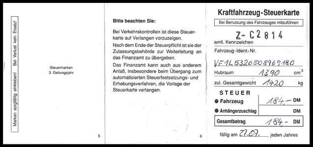 Jahressteuerbetrag 184,- DM / Hubraum 1.390 ccm |