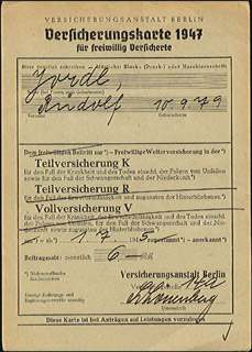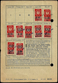 | Karte für Freiwillig Versicherte | mit Wertmarken 6,- RM - mit Monatsangabe, ab 1,7.1947 Aufdruck 1947 | Karte für Freiwillig Versicherte | mit Wertmarken 6,- RM - mit Monatsangabe, ab 1,7.1947 Aufdruck 1947 | |||||||||