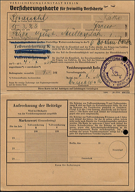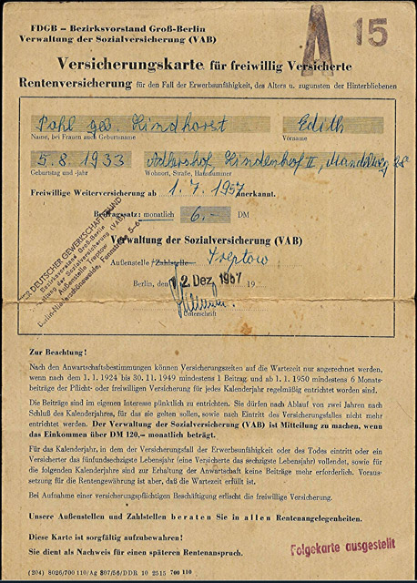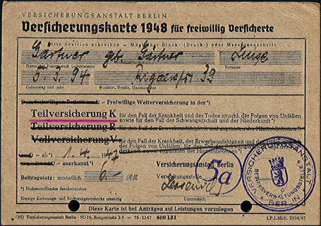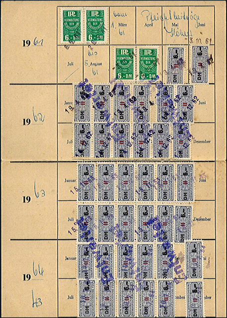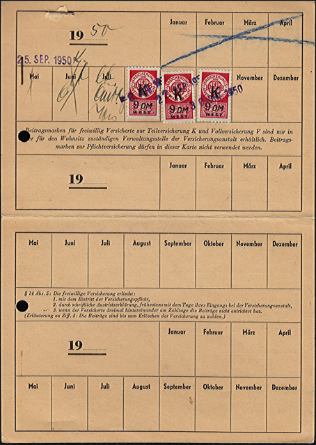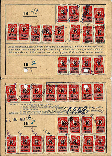 mit Wertmarken 6,- DM - Monat - überdruckt und Aufdruck K = Teilversicherung |