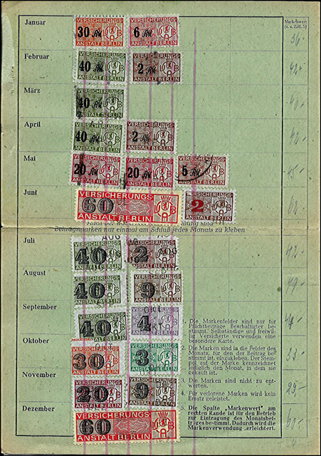 | Karte für Freiwillig Versicherte oder Atbeitnehmer | mit Wertmarken 6,- RM - mit Monatsangabe | ||||||||||||