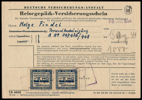 | Versicherungschein für Reisegepäck oder Expressgut, Dokument für 1959 - Marken Aufdruck rotes W | Versicherungschein für Reisegepäck oder Expressgut, Dokument für 1954 | |||||