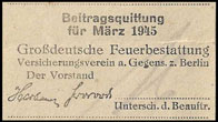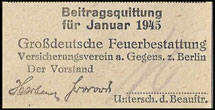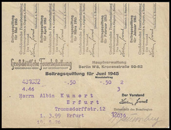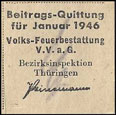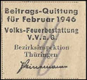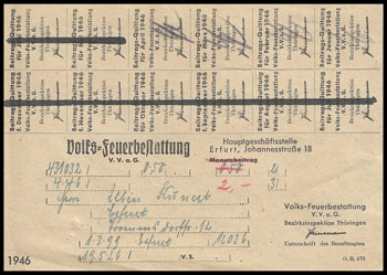 ![]() ab Monat Mai 1946 wurde die Feuer-Versicherung ruhend gestellt oder aufgelöst (Umbau des Versicherungswesens in der SBZ bzw. DDR) - Quittungsbogen = Schwärzung der Restmonate 1946 |
