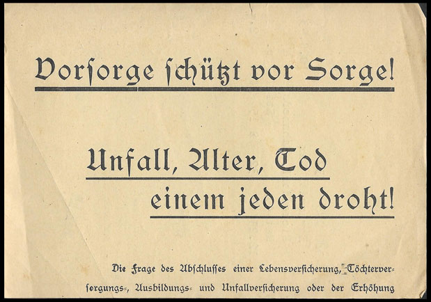 | Lebensversicherung 2.- RM (die gewährlte Versicherungs-Art ist nicht eindeutig bestimmbar - es wird jedoch eine Lebensversicherung vermutet) | ||||||||