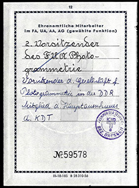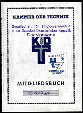 Photogrammetrie (die exakte dreidimensionale geometrische Rekonstruktion des aufgenommenen Objekts) auch Bildmessung genannt, ist eine Gruppe von berührungslosen Messmethoden und Auswerteverfahren, um aus Fotografien eines Objektes durch Bildmessung seine Lage und Form indirekt zu bestimmen sowie durch Bildinterpretation dessen Inhalt zu beschreiben. Neben Fotografien kommen aber auch andere Sensoren zum Einsatz wie Radar mit synthetischer Apertur (SAR) und Laserscanner. In der DDR gründete sich am 31. Mai 1960 in Dresden eine Gesellschaft für Photogrammetrie und Fernerkundung der DDR (GfPhDDR). Auf dem. IX. Kongress in London, in der Generalversammlung des ISP (Internationale Gesellschaft für Photogrammetrie und Fernerkundung) wurde die Gesellschaft der DDR aufgenommen. Sie hatte bis zu 266 Mitglieder. Die Mitgliederversammlung der Gesell- Ziele der GfPh DDR waren die Pflege und Förderung der Photogrammetrie und Fernerkundung und ihrer Anwendungen im Vermessungswesen, der Kartographie sowie in nichttopographischen Bereichen in der DDR sowie die Weiterbildung ihrer Mitglieder in Arbeitsgruppen und auf wissenschaftlich-technischen Jahrestagungen. |