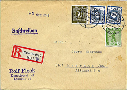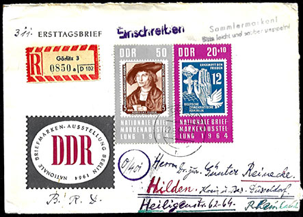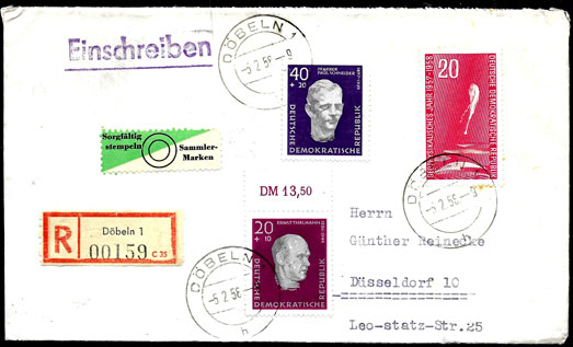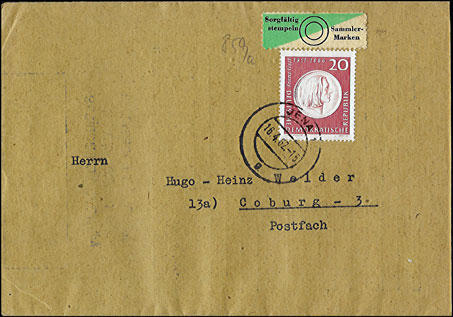 auf der Briefvorderseite unter "EINSCHREIBEN" eine "Hinweismarke" des Philatelistenverbandes auf Sammlermarken |
