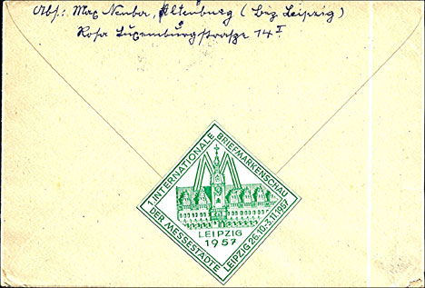 1. Internationale Briefmarkenschau der Messestädte Leipzig (Abs.: Mitglied Philatelistenverband) | Vignette als Verschlussmarke genutzt | 1. Internationale Briefmarkenschau der Messestädte in Leipzig |