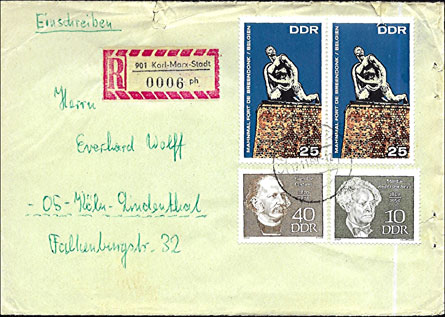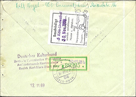 beschädigte Sendung | Einschreiben d. Deutschen Post | Stempel - Philatelistenverband d. DDR Tauschkontrollstelle Bezirk Karl-Marx-Stadt | ||||||||||