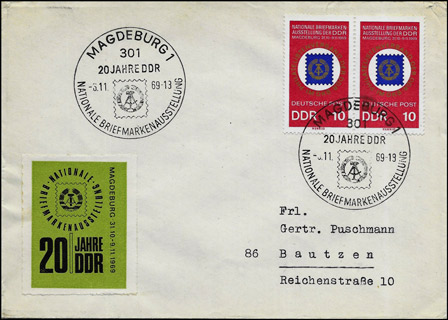Jubiläums-BMA Karl-Marx-Stadt - "20 Jahre DDR" | Nationale BMA in Magdeburg - 20 Jahre DDR als Einzelvignette auf Briefen verwendet | ||||||||||