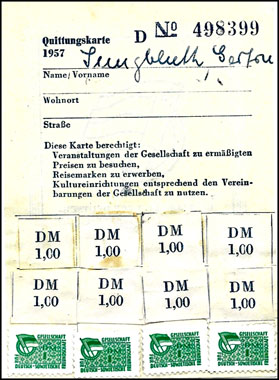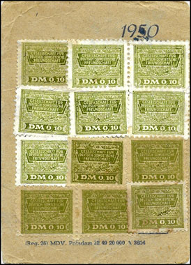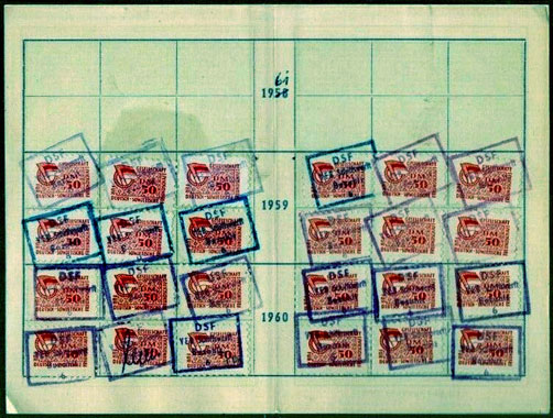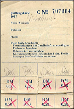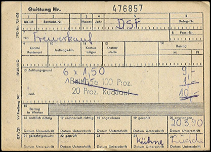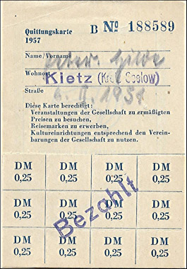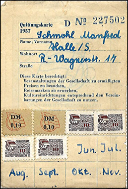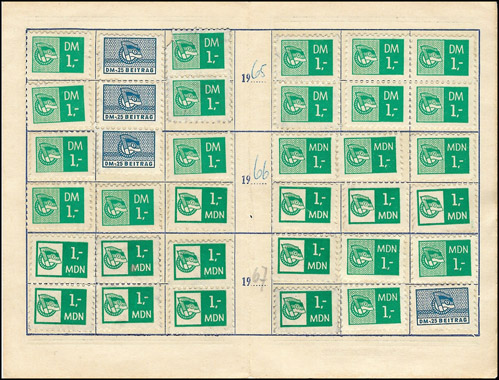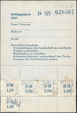 Quittungskarte SERIE D - ohne Druckvermerk mit Marken (ohne Wertbindung an der Einlage) | Quittungskarte SERIE D - mit Notausgabe-Marken 1957 und BM von 1958 | ||||||