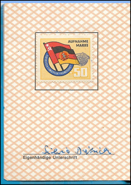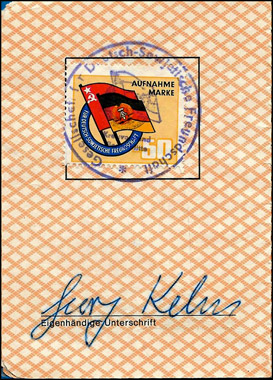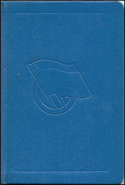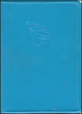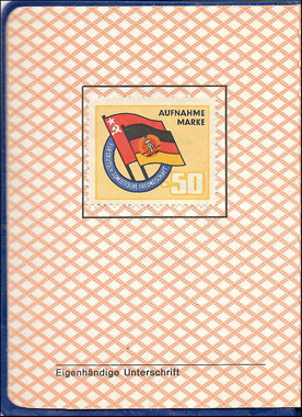 Einband Plaste - verschiedene Hellblau-Töne | 1.-Seite Entwertet mit Eintritts-Marke | 1.-S Entwertet mit Stempel der Gruundorganisation | 1.-Seite Entwertet - Hinweis Buch-Umtausch |