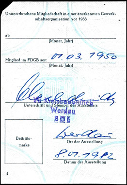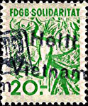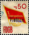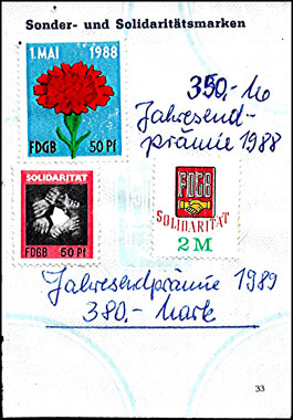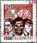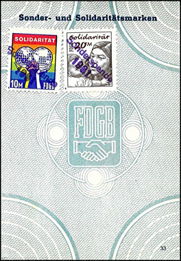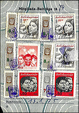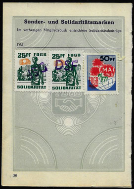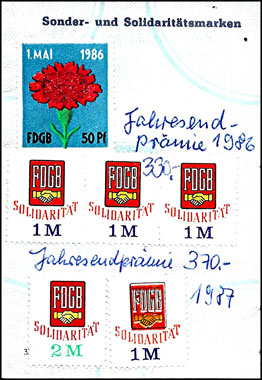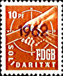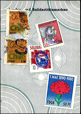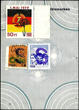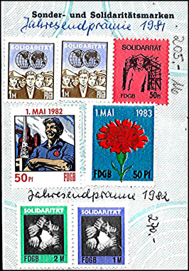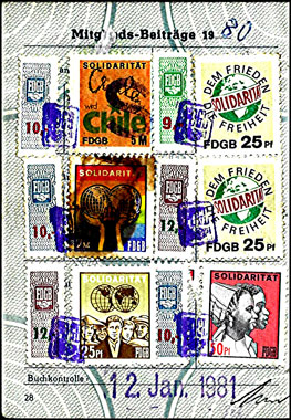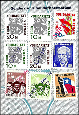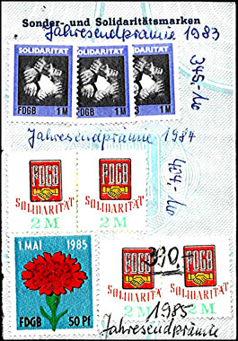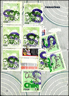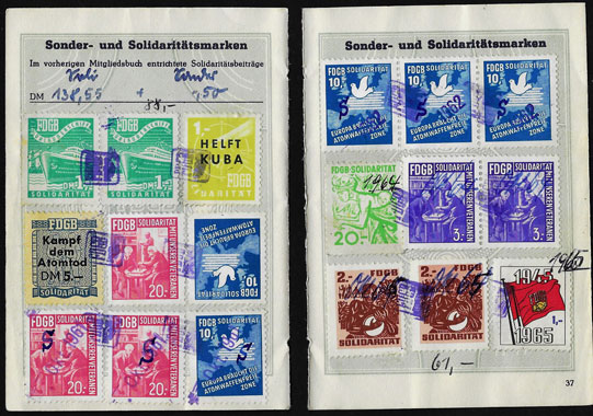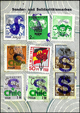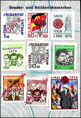 Der Einsatz überstempelter Marken in den FDGB Ausweisen erfolgte in der Regel "dezentral", das heisst derartige Stempel zu verwenden lag in der Entscheidung der jeweiligen BGL (Betriebsgewerkschaftsleitung). Damit ist davon auszugehen, dass diese Art der besonderen Spendenaktivitäten vorwiegend in den Großbetrieben genutzt wurde, um zusätzliche Mittel für die internationale Solidarität der Gewerkschaften zu generieren, * Es wurden hier auch mehrere Marken aus dem Katalog von K. Brockmöller (Ausg. 03/2019) wiedergegeben, soweit die Bildauflösung / Erkennbarkeit dies zugelassen hat. |