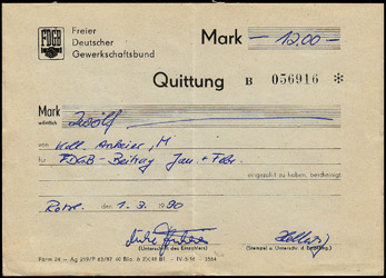 Bedingt durch den Prozess der friedlichen Revolution in der DDR und dem Weg zur Deutschen Einheit, kam es im Rahmen der Auflösung des FDGB offensichtlich auch zu örtlichen Versorgungs-Mängeln bei der Bereitstellung von Beitragsmarken. Die nebenstehenden Beitragsquittungen von 1990 dokumentieren die Zahlung der Mitgliedsbeiträge ohne Markenausgabe |