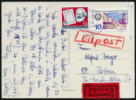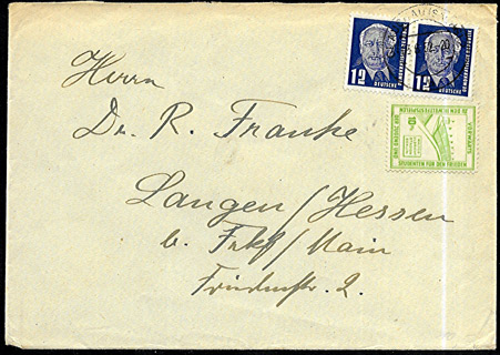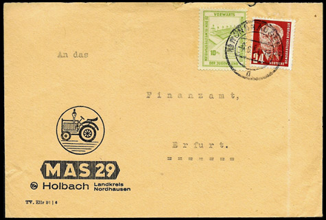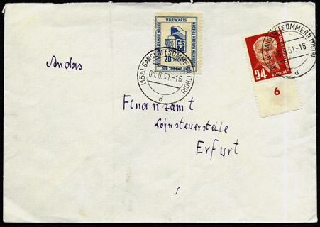 Eilbrief 1951 Vorderseite - Werbestempel für 5 Jahrplan und Frieden | Eilbrief 1951 Rückseite mit Vignette zu den III. Weltfestspielen in Berlin |