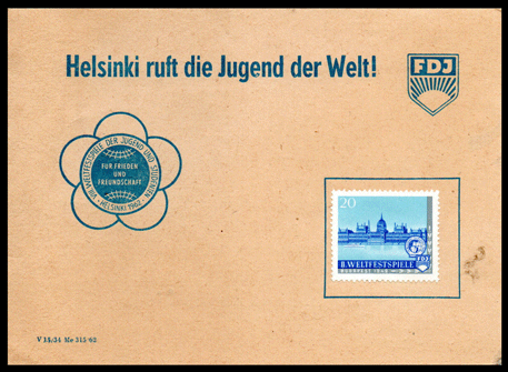 Spendenkarte Weltfestspiele in Helsinki 1962 - mit Spendenmarke Wert 20 Pf | 1962/3 | ||||