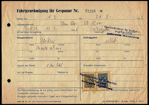 Bezirksdirektion für Kraftverkehr Potsdam - Außenstelle Brandenburg, Fahrgenehmigung für ein (Pferde-) Gespann | ||||||