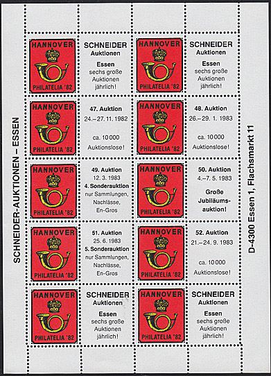Internationale BMA "Philatelia" 1982 - kompletter Vignettenbogen | motivgleicher Vignettenbogen - westdeutesche Fa. "SCHNEIDER-Auktionen" (Verweis auf die Auktionen 1983) |