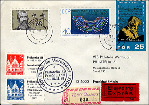 Internationale BMA "Philatelia" 1981 - Werbebrief (Reprint von Briefmarken auf OriginalBeleg Freimarken Bautenserie - Alliierte Besetzung) |