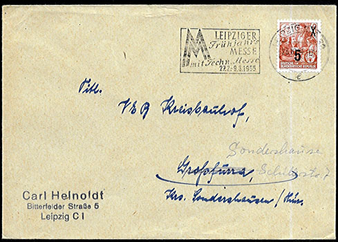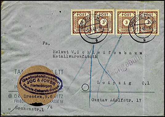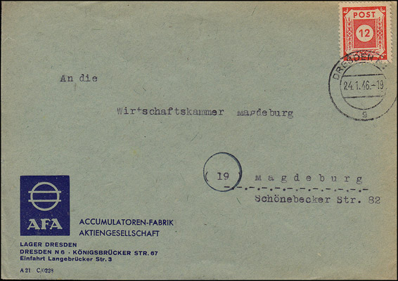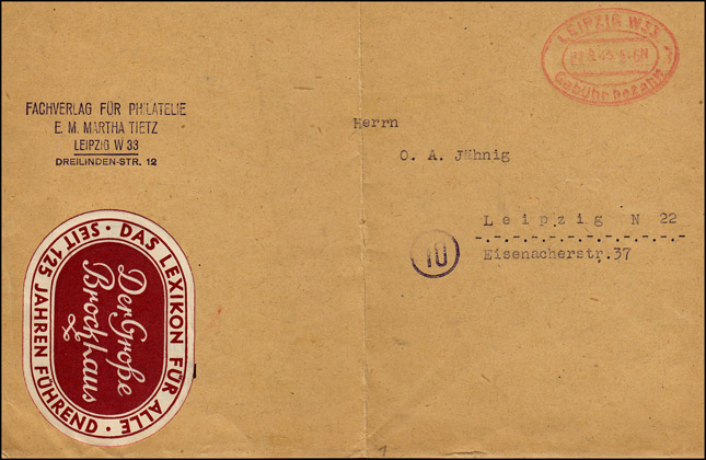 ![]() Im Jahr 1814 wurde das Geschäft „F. A. Brockhaus“ gegründet und zwischen 1817 und 1818 zog der Verlag nach Leipzig, wo Brockhaus später dann auch eine eigene Druckerei betrieb. Nach dem Zweitem Weltkrieg wurde der Leipziger Verlag 1953 verstaatlicht und als VEB Brockhaus Leipzig weitergeführt. Der private Verlag Brockhaus bestand in Wiesbaden weiter und nannte sich wieder „F. A. Brockhaus“. Dokument: Briefpost 27.09.1945 |