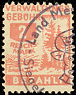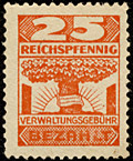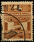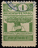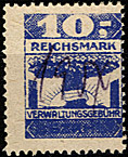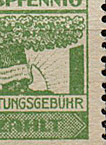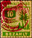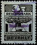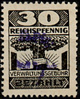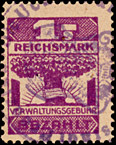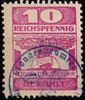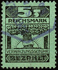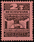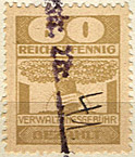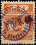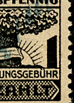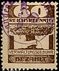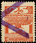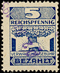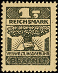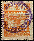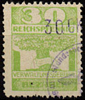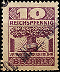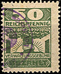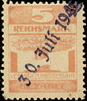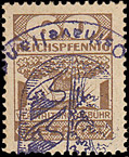 Währung "Reichsmark", Verwendung für die Länder Thüringen, Brandenburg und Sachsen sowie Reichsgau Wartheland nachgewiesen. Die zweite Serie hat einen deutlich größeren Abstand im Druckbild zwischen der Baum-Belaubung rechts und dem darunter stehenden senkrechten Balken, siehe Beschreibung der ersten Serie. Das Wort "BEZAHLT" begrenzt das Druckfeld. |