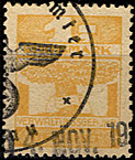 Währung "Reichsmark" / Nachgewiesen z.Bsp. 1940 für Danzig-Westpreußen Die erste Serie fällt u.A. durch einen geringen Abstand zwischen der Baum-Belaubung rechts und dem darunter stehenden senkrechten Balken auf. Das Wort "BEZAHLT" ist kleiner gedruckt, mit Platz zum Druckfeldende. |