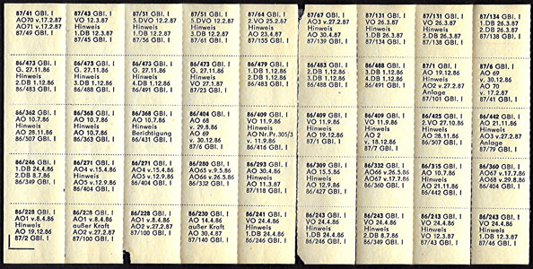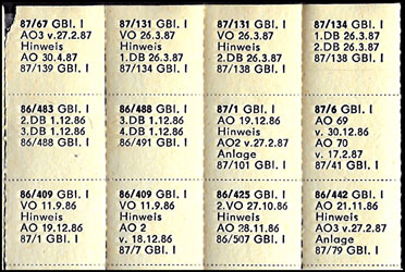 Bisher liegen nur Marken aus dem Jahre 1987 vor (hier vergrößerter Ausschnitt) - jede Marke verweist auf eine spezielle Vorschrift | |||||||
