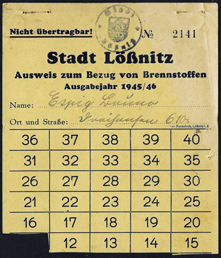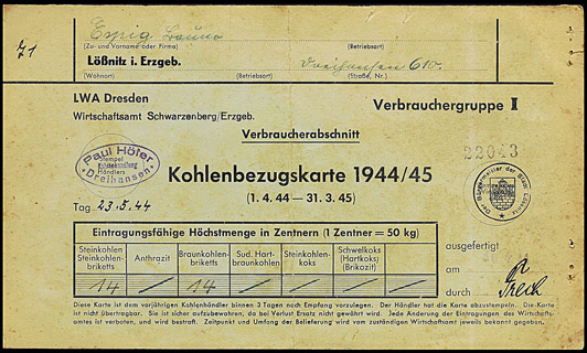 Kohlenbezugskarte für Steinkohlen/Braunkohlenbriketts - bis März 1945 | ||||||||